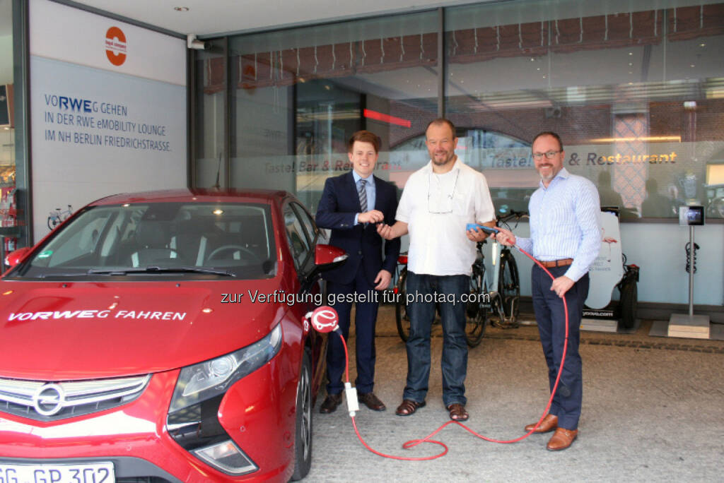 Welterbe-Marathon mit dem E-Auto: Dennis Heusser von der Adam Opel AG, Roland Wagner vom Webportal visitatio.de, RWE Hauptstadtrepräsentant Leo Peter Graef: In der RWE eLounge in Berlin wurde ein Elektromobil vom Typ Opel Ampera für den Welterbe Marathon übergeben. RWE unterstützt die Rundreise zu den 39 UNESCO-Welrterbestätten mit Ökostrom.", © Aussendung (08.08.2014)