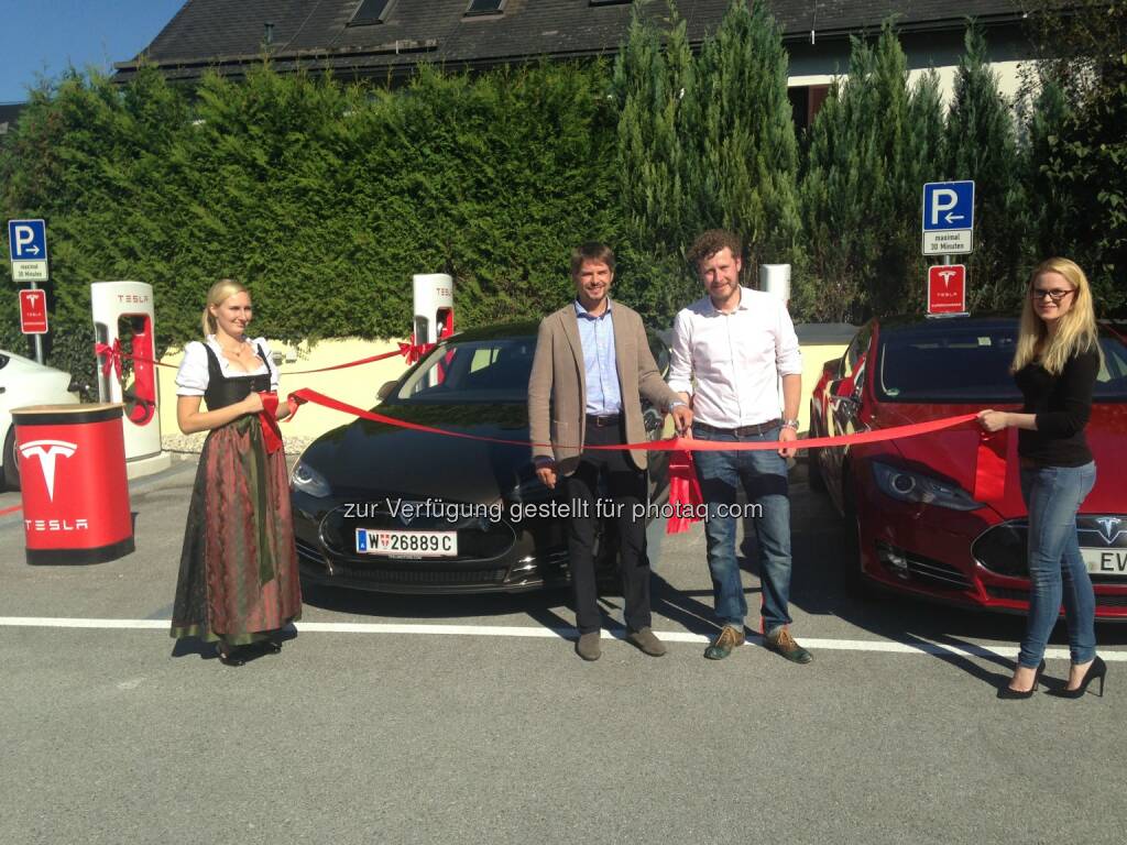 Richard Absenger, Geschäftsführer Hotel Kaiserhof und Daniel Hammerl, Country Director Tesla Österreich: Der neue Supercharger Salzburg wurde heute offiziell eröffnet. Hotel Kaiserhof: Tesla's Supercharger Netzwerk wächst weiter, © Aussendung (17.09.2014)