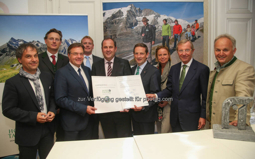 Günter Mussnig (GF Hohe Tauern - die Nationalpark-Region in Kärnten), Johannes Hörl (GD Großglockner Hochalpenstraßen AG), Günter Platter (LH Tirol), Bernhard Pichler (Osttirol Werbung), Josef Pröll (Regierungsbeauftragter EXPO 2015), Christian Benger (Landesrat Kärnten), Petra Stolba (GF Österreich Werbung), Wilfried Haslauer (LH Salzburg) und Christian Wörister (GF Ferienregion Nationalpark Hohe Tauern GmbH, Salzburg): Großglockner Hochalpenstraßen AG: EXPO 2015 - "Hohe Tauern & Großglockner Hochalpenstraße", © Aussendung (30.09.2014)