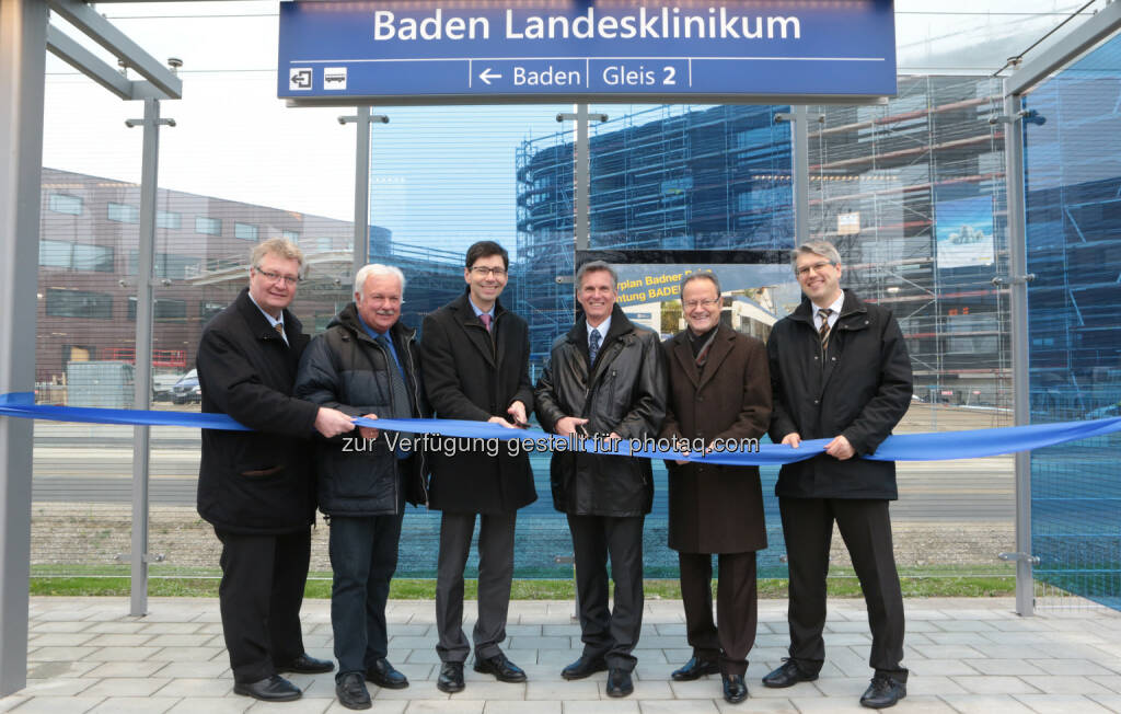 LAbg. Bgm. Christoph Kainz, Bgm. Kurt Staska, WLB-Vorstandsdirektor Franz Stöger, WLB-Vorstandsdirektor Thomas Duschek, KH-BW Helmut Krenn, Wolfgang Hassler: Wiener Lokalbahnen eröffnen 36. Badner Bahn-Haltestelle, © Aussendung (15.12.2014)