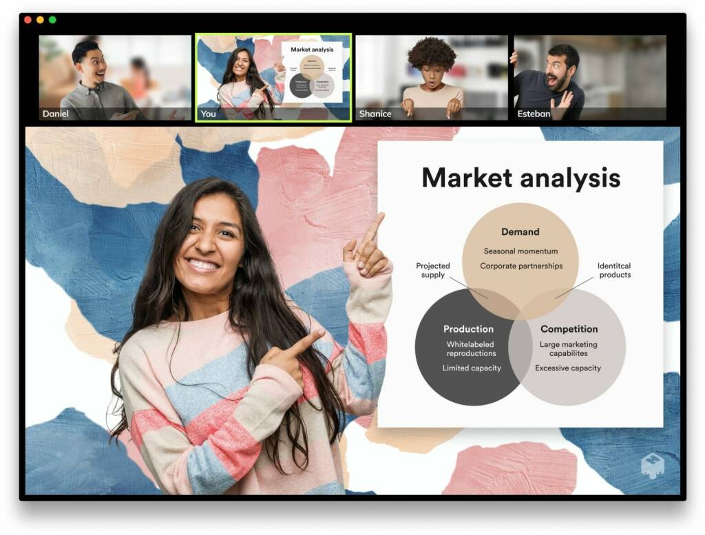 Die mmhm-App steht kostenlos für alle zur Verfügung und bietet zahlreiche Funktionen, die oft eintönige Videokonferenzen ansprechender und interaktiver gestalten: Nutzer können aus einer Vielzahl virtueller Hintergründe und Meetingräume wählen, diese individuell anpassen und zur "persönlichen Show" machen; Fotocredit:mmhmm (13.11.2020)