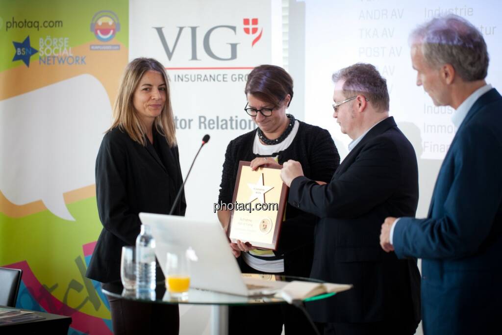 Flughafen Wien wird in die Hall of Fame aufgenommen: Judit Helenyi (Leitung Investor Relations, Flughafen Wien) übernimmt den Preis von Gregor Rosinger (Rosinger Group) und Christian Drastil (BSN) http://www.boerse-social.com/hall-of-fame, © Michaela Mejta (04.07.2017)