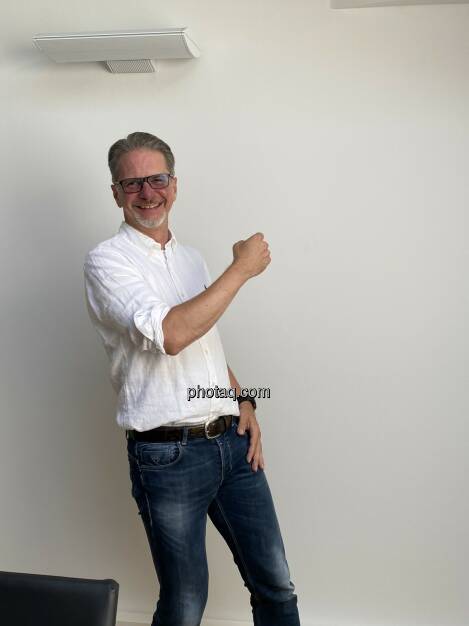 Wolfgang Matejka, vorher (Matejka & Partner Asset Management), Anm: Eine fast perfekte Vorlage, weisses Shirt mit viel Platz für Choose Optimism (01.04.2020)