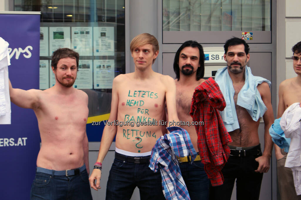 Mit einem Flashmob in einer Bankfiliale einer der Pleite-ProfiteurInnen protestierte heute früh die Wahlallianz Europa Anders gegen die angekündigte Abwicklung der Hypo Alpe-Adria. Symbolisch gaben mehrere Aktivisten ihr letztes Hemd für die Bankenrettung.