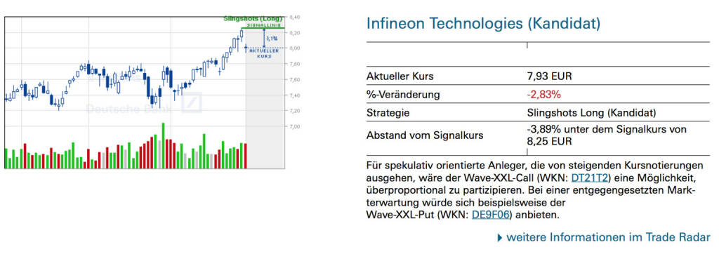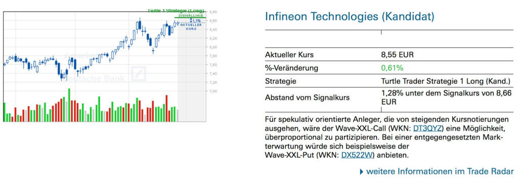 Infineon Technologies (Kandidat): Für spekulativ orientierte Anleger, die von steigenden Kursnotierungen ausgehen, wäre der Wave-XXL-Call (WKN: DT3QYZ) eine Möglichkeit, überproportional zu partizipieren. Bei einer entgegengesetzten Markterwartung würde sich beispielsweise der Wave-XXL-Put (WKN: DE922A) anbieten., © Quelle: www.trade-radar.de (26.03.2014)