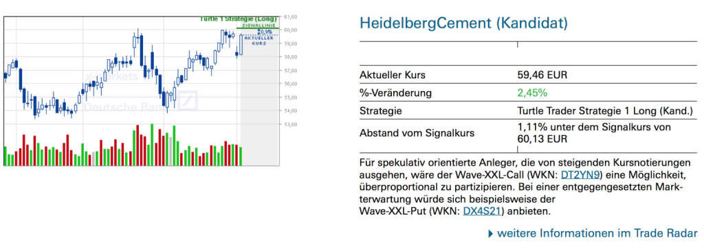 HeidelbergCement (Kandidat): Für spekulativ orientierte Anleger, die von steigenden Kursnotierungen ausgehen, wäre der Wave-XXL-Call (WKN: DT2YN9) eine Möglichkeit, überproportional zu partizipieren. Bei einer entgegengesetzten Mark- terwartung würde sich beispielsweise der Wave-XXL-Put (WKN: DX4S21) anbieten., © Quelle: www.trade-radar.de (05.03.2014)