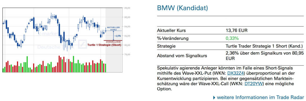 BMW (Kandidat): Spekulativ agierende Anleger könnten im Falle eines Short-Signals mithilfe des Wave-XXL-Put (WKN: DT3H25) überproportional an der Kursentwicklung partizipieren. Bei einer gegensätzlichen Markteinschätzung wäre der Wave-XXL-Call (WKN: DX9ULG) eine mögliche Option., © Quelle: www.trade-radar.de (14.03.2014)