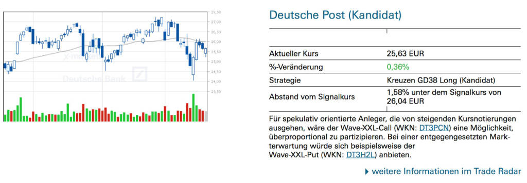 Deutsche Post (Kandidat): Für spekulativ orientierte Anleger, die von steigenden Kursnotierungen ausgehen, wäre der Wave-XXL-Call (WKN: DT3PCN) eine Möglichkeit, überproportional zu partizipieren. Bei einer entgegengesetzten Markterwartung würde sich beispielsweise der Wave-XXL-Put (WKN: DX9QVV) anbieten., © Quelle: www.trade-radar.de (27.03.2014)