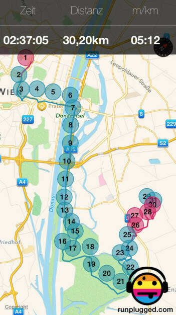 30,2 Km mit Friedensbrücke, Praterstrasse, Donauinsel, Lobau, Gross Enzersdorf, Seestadt (26.07.2015)