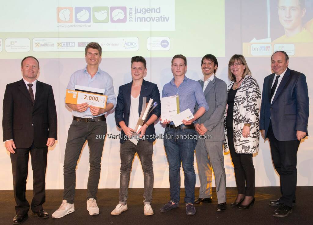 SC Michael Losch/BMWFW, Team „Craft 2.0“/die Graphische, Projektlehrer Bernhard Comploj, Anneliese Ecker/BMBF, SC Christian Dorninger/BMBF. Mit dem Hauptpreis in der Kategorie Young Entrepreneurs wurde das Projekt "Craft 2.0" der Graphischen in Wien ausgezeichnet. Die drei Schüler Fabio Eppensteiner, Alexander Hackel und Philipp Weingartner haben es sich im Rahmen ihres Projekts zur Aufgabe gemacht, heimische Handwerks- und Gewerbebetriebe darin zu unterstützen, ein eigenes Erscheinungsbild, also Corporate Design, zu finden und so ihre Kommunikation mit Endkunden zu erleichtern., © aws, Voglhuber (29.05.2014)