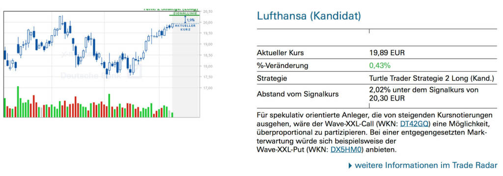 Lufthansa (Kandidat): Für spekulativ orientierte Anleger, die von steigenden Kursnotierungen ausgehen, wäre der Wave-XXL-Call (WKN: DT42GQ) eine Möglichkeit, überproportional zu partizipieren. Bei einer entgegengesetzten Markterwartung würde sich beispielsweise der Wave-XXL-Put (WKN: DX5HM0) anbieten., © Quelle: www.trade-radar.de (10.06.2014)