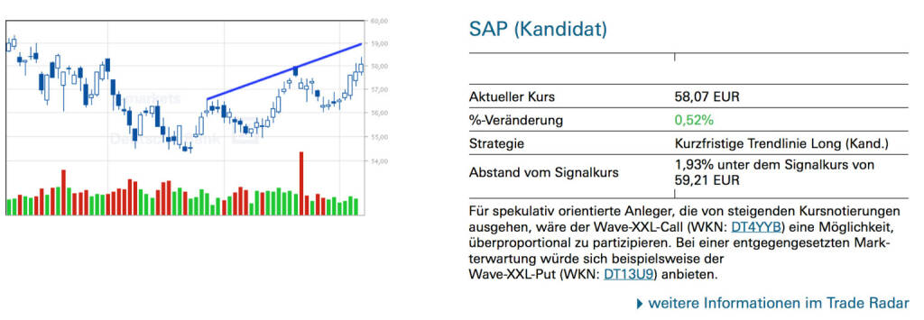 SAP (Kandidat): Für spekulativ orientierte Anleger, die von steigenden Kursnotierungen ausgehen, wäre der Wave-XXL-Call (WKN: DT4YYB) eine Möglichkeit, überproportional zu partizipieren. Bei einer entgegengesetzten Markterwartung würde sich beispielsweise der Wave-XXL-Put (WKN: DT2EKM) anbieten., © Quelle: www.trade-radar.de (14.07.2014)