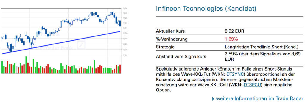 Infineon Technologies (Kandidat) Für spekulativ orientierte Anleger, die von steigenden Kursnotierungen ausgehen, wäre der Wave-XXL-Call (WKN: DX1ZD1) eine Möglichkeit, überproportional zu partizipieren. Bei einer entgegengesetzten Markterwartung würde sich beispielsweise der Wave-XXL-Put (WKN: DT43TF) anbieten., © Quelle: www.trade-radar.de (03.07.2014)