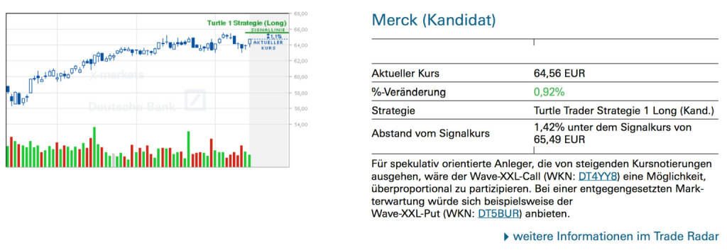 Merck (Kandidat): Für spekulativ orientierte Anleger, die von steigenden Kursnotierungen ausgehen, wäre der Wave-XXL-Call (WKN: DT4YY8) eine Möglichkeit, überproportional zu partizipieren. Bei einer entgegengesetzten Markterwartung würde sich beispielsweise der Wave-XXL-Put (WKN: DT5BUS) anbieten., © Quelle: www.trade-radar.de (30.07.2014)