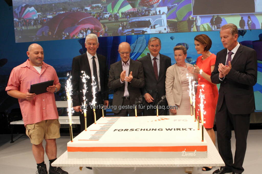 Rudi Roubinek, Klaus Pseiner (Geschäftsführer FFG), Toni Innauer, Bundesminister Alois Stöger (BMVIT), Gertrude Tumpel-Gugerell (Aufsichtsratsvorsitzende FFG), Henrietta Egerth (Geschäftsführerin FFG), Bundesminister Reinhold Mitterlehner (BMWFW) FFG - Österreichische Forschungsförderungsgesellschaft: FFG Forum 2014: Innovations- und Technologiestandort Österreich stärken, © Aussender (19.09.2014)