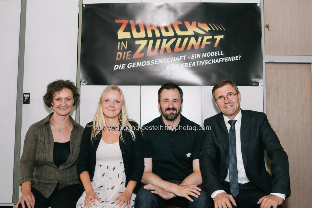 Marianne Gugler (Mitgründerin der otelo eGen), Karin Hufnagl (Kreativschaffende, Mitgründerin otelo eGen), Patrick Bartos (CREATIVE REGION) und Franz Gessl (Raiffeisenverband Oberösterreich eGen): Creative Region Linz & Upper Austria GmbH: Kreativwirtschaft: Zurück in die Zukunft mit der Genossenschaft, © Aussender (19.09.2014)