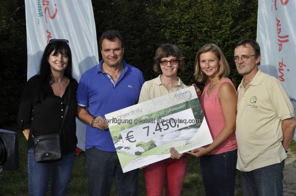 Gabriele Schlögl, Bgm. Schlögel, Susanne Käfer (Geschäftsführung Naturpark Purkersdorf), Stephanie Adler (Projektmanagement Greenfinity Foundation) und Rudolf Orthofer (Obmann Naturpark Purkersdorf) freuen sich über die Spende - Spendenaktion der Lyoness Open 2014 kommt dem Generationenwald in Purkersdorf zugute (Bild: Lyoness), © Aussender (23.09.2014)