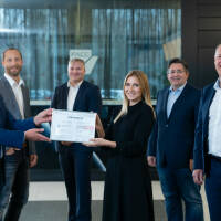 Berg: Henrike Brandstötter, Rosam Change Communications, scherzt mit dem Gipfelkreuz des Ortler
