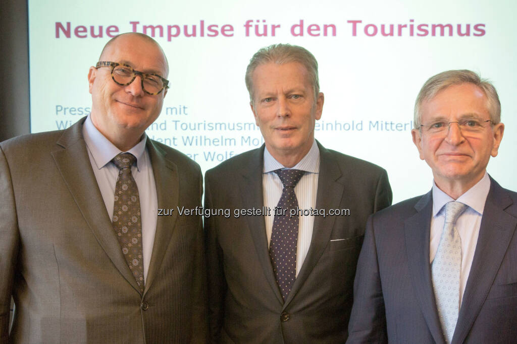 Wirtschafts- und Tourismusminister Reinhold Mitterlehner (M/ÖVP), der Vizepräsident der Europäischen Investitionsbank (EIB), Wilhelm Molterer (R) und der Geschäftsführer der Österreichischen Hotel- und Tourismusbank (ÖHT), Wolfgang Kleemann (L): Bundesministerium für Wissenschaft, Forschung und Wirtschaft: Mitterlehner: Neues Finanzierungspaket für die Konjunkturstütze Tourismus, © Aussender (08.01.2015)