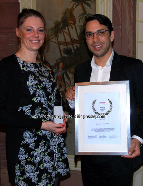 Sabrina Papp, Head of Business Development von FTAPI und Philippe Souidi, Head of Marketing von FTAPI nahmen die Auszeichnung im Namen der QSC AG entgegen: Die Experton Group hat in ihrem aktuellen „Security Vendor Benchmark 2015“ in der Kategorie „Managed Security Services“ die QSC AG mit dem Prädikat „Security Leader“ ausgezeichnet. , © Aussendung (18.02.2015)