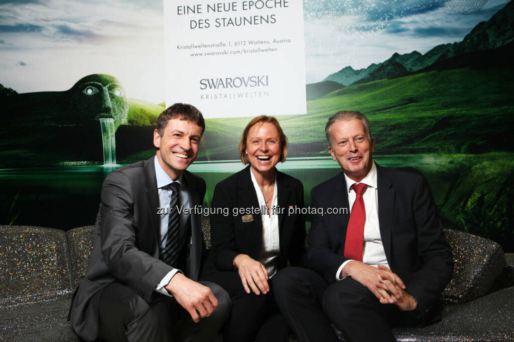 Stefan Isser (Geschäftsführer der D. Swarovski Tourism Services Gmbh), Petra Stolba (Geschäftsführerin der Österreich Werbung) und Vizekanzler Reinhold Mitterlehner (Bundesminister Bundesminister für Wissenschaft, Forschung und Wirtschaft): D. Swarovski Tourism Services Gmbh: ITB 2015: Swarovski Kristallwelten präsentieren Details zur Wiedereröffnung, © Aussender (04.03.2015)