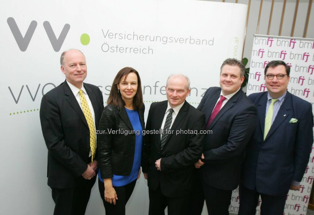 Othmar Thann (Direktor des KFV), Familienministerin Sophie Karmasin, Peter Thirring (VVO-Vizepräsident, Vorstandsvorsitzender Generali Versicherung AG), Kinderunfallexperte Lars-Peter Kamolz (Leiter der Klinischen Abteilung für Plastische, Ästhetische und Rekonstruktive Chirurgie am LKH-Univ. Klinikum Graz) und Louis Norman-Audenhove (Generalsekretär des österreichischen Versicherungsverbandes VVO): Verband der Versicherungsunternehmen Österreichs: Fortsetzung der "Vision Zero 2020": Österreich für Kinder sicherer machen!, © Aussender (11.03.2015)