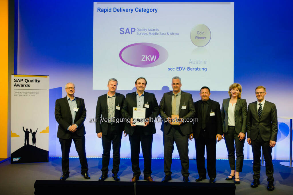 Mike Simons (Chief Editor, ComputerWorld UK), Thomas Hauser (Sales Management, scc EDV-Beratung), Harald Fraunlob (Betriebsleiter, ZKW Elektronik), Wolfgang Sieger (Head of Logistics & SAP-Application Management, ZKW Elektronik), Franck Cohen (President, SAP), Annette McKenzie (Regional Quality Director, SAP), Henrik Wilken (Vice President Active Quality Management, SAP): SCC EDV-Beratung AG: scc Projekt bei ZKW Elektronik mit dem SAP Quality Award Emea-weit in Gold ausgezeichnet, © Aussendung (07.05.2015)