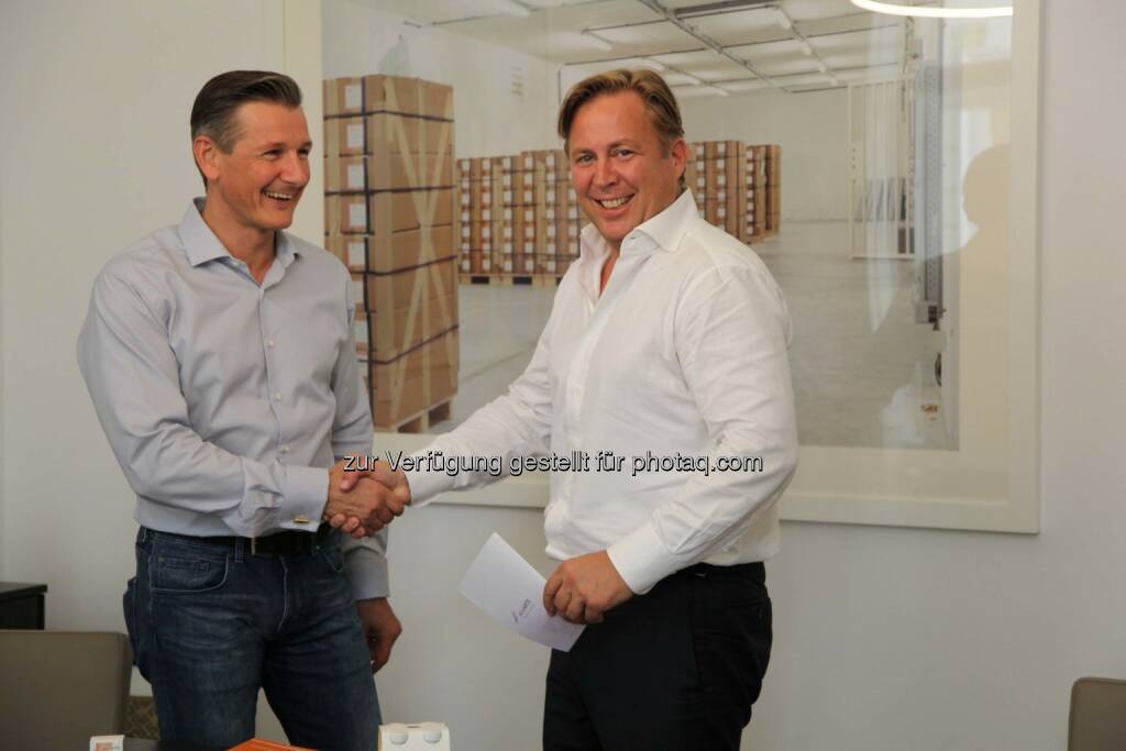 Alexander Schütz, Helmut Essl (CEO HSO Health Care), C-Quadrat Gründer Alexander Schütz steigt bei Austro-Probiotika-Firma HSO Health Care ein. (C) HSO Health Care, © Aussendung (10.07.2015)