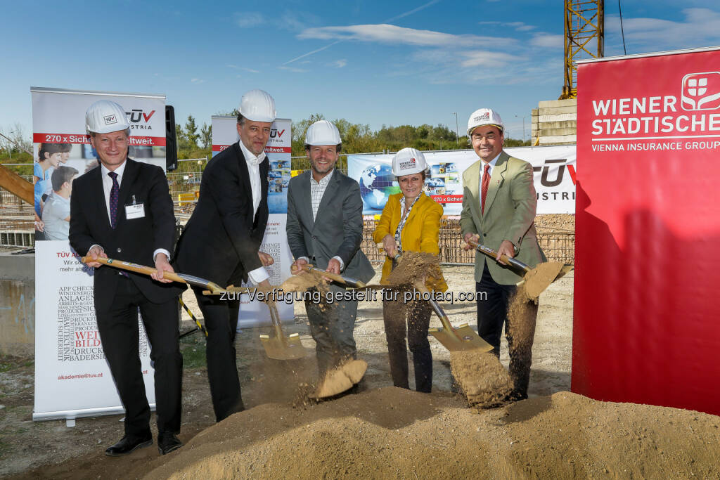 Stefan Haas (GF der TÜV Austria Gruppe), Christian Heiss (Atelier Heiss), Ronen Seller (Prok. Strauss & Partner Development GmbH), Christine Dornaus (Vorstandsmitglied der Wiener Städtischen Versicherung), Andreas Linhart (Bgm. Marktgem. Brunn/Gebirge) : Neue TÜV Austria Zentrale am Campus 21 : Bauherr: Wiener Städtische Versicherung : © Wiener Städtische/Richard Tanzer, © Aussendung (21.09.2015)