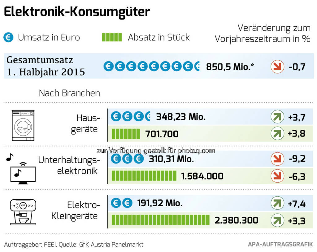 Elektronik-Konsumgütermarkt im 1. Halbjahr 2015 : Gesamtumsatz leicht auf 850, 50 Mio. Euro gesunken (-0,7 Prozent), Unterhaltungselektronik mit 9-prozentigem Minus, Umsatz mit Hausgeräten deutlich um 4 Prozent auf 348,23 Mio. Euro gestiegen, Elektro-Kleingeräte verzeichnen mit einem Plus von 7 Prozent auf 192 Mio. Euro ein deutliches Umsatzwachstum : Die Nachfrage nach elektronischen Geräten im Konsumgütermarkt hat sich in Österreich im ersten Halbjahr 2015 im Bereich der Hausgeräte und der Elektro-Kleingeräte sehr positiv entwickelt. Allein der Markt der Unterhaltungselektronik leidet unter dem starken Euro und einem Jahr ohne sportliche Großereignisse wie Olympia oder Fußball-Weltmeisterschaften : Fotocredit: feei, © Aussender (03.09.2015)