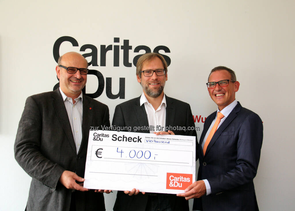 Rudolf Mittendorfer, Alexander Bodmann (Caritas), Gunther Riedlsperger : Fachverband der Versicherungsmakler: Solidarität mit den Flüchtlingen in Traiskirchen : Spendenübergabe als Zeichen der Menschlichkeit : © Fachverband der Versicherungsmakler/WKO , © Aussender (03.08.2015)
