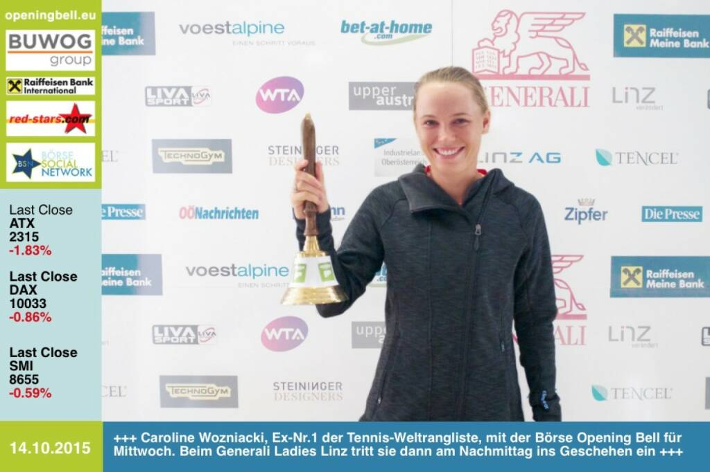 #openingbell am 14.10: Caroline Wozniacki, Ex-Nr.1 der Tennis-Weltrangliste, mit der Börse Opening Bell für Mittwoch. Beim Generali Ladies Linz tritt sie dann am Nachmittag ins Geschehen ein #wtalinz #CaroWozniacki http://www.openingbell.eu (14.10.2015)