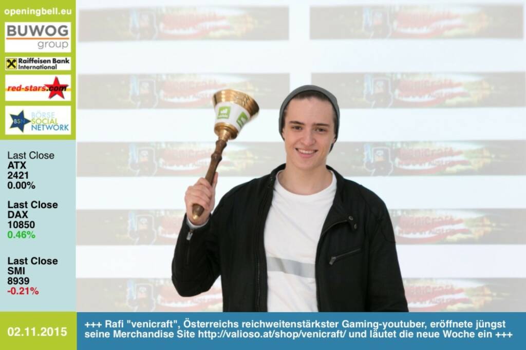 #openingbell am 2.11.: Rafi "venicraft", Österreichs reichweitenstärkster Gaming-youtuber, eröffnete jüngst seine Merchandise Site http://valioso.at/shop/venicraft/ und läutet die neue Woche ein -> mehr von venicraft: http://bit.ly/1Pg6LaY http://www.openingbell.eu (02.11.2015)