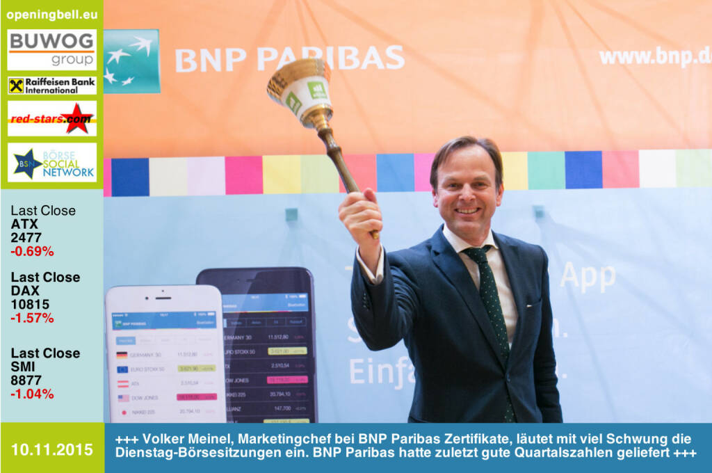 #openingbell am 10.11.: Volker Meinel, Marketingchef bei BNP Paribas Zertifikate, läutet mit der Opening Bell mit viel Schwung die Dienstag-Börsesitzungen ein. BNP Paribas hatte zuletzt tolle Quartalszahlen geliefert http://www.openingbell.eu (10.11.2015)