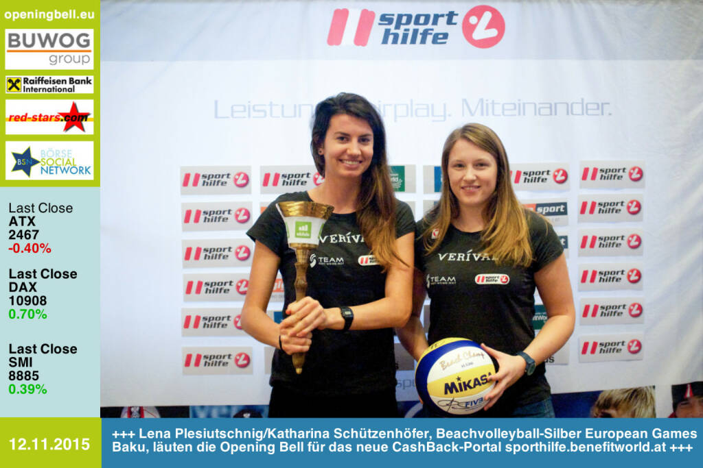 #openingbell am 12.11.: Lena Plesiutschnig und Katharina Schützenhöfer, Beachvolleyball-Silber European Games Baku, läuten die Opening Bell für das neue CashBack-Portal http://sporthilfe.benefitworld.at http://www.openingbell.eu (12.11.2015)
