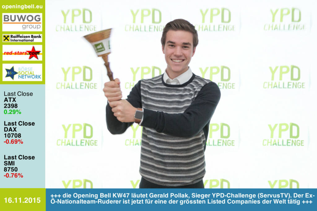 #openingbell am 16.11.: Die Opening Bell KW47 läutet Gerald Pollak, Sieger YPD-Challenge (ServusTV). Der Ex-Nationalteam-Ruderer Österreichs ist jetzt für eine der grössten Listed Companies der Welt tätig http://www.openingbell.eu (16.11.2015)