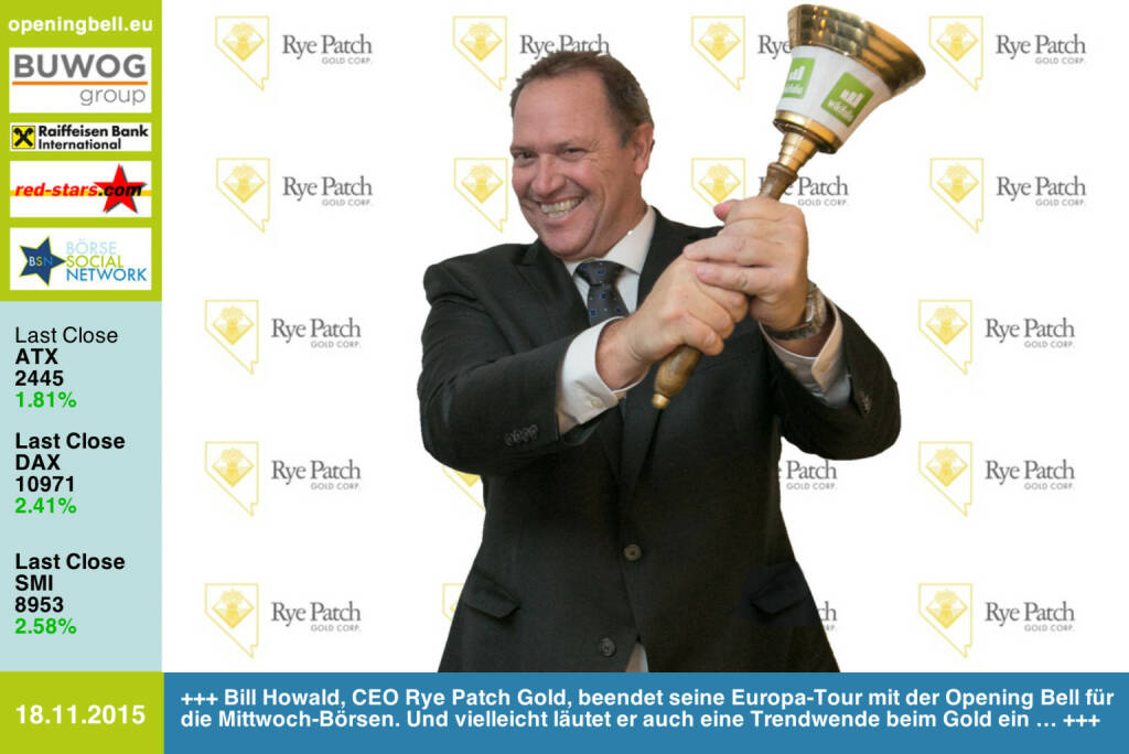 #openingbell am 18.11.: Bill Howald, CEO Rye Patch Gold, beendet seine Europa-Tour mit der Opening Bell für die Mittwoch-Börsen. Und vielleicht läutet er ja auch eine Trendwende beim Gold ein … http://ryepatchgold.com http://www.openingbell.eu (18.11.2015)