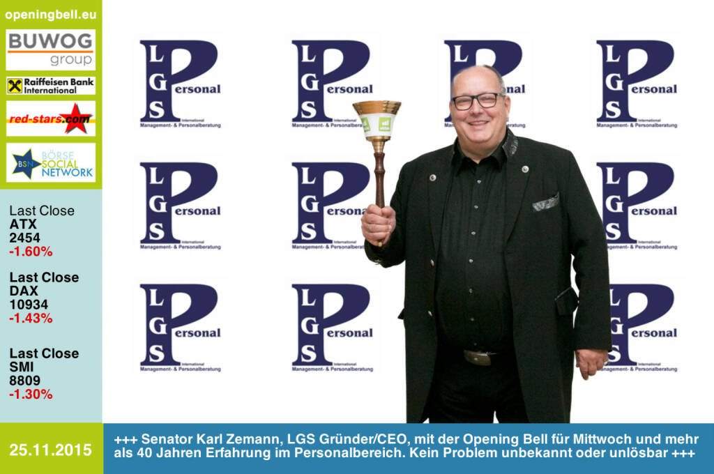 #openingbell am 25.11.: Senator Karl Zemann, LGS Gründer & CEO, mit der Opening Bell für Mittwoch und mehr als 40 Jahren Erfahrung im Personalbereich. "Kein Problem ist uns unbekannt oder unlösbar" http://www.lgs-personal.at http://www.openingbell.eu (25.11.2015)