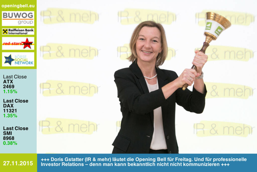 #openingbell am 27.11.: Doris Gstatter (IR & mehr) läutet die Opening Bell für Freitag. Und für professionelle Investor Relations – denn man kann bekanntlich nicht nicht kommunizieren http://www.gstatter.com http://www.openingbell.eu (27.11.2015)