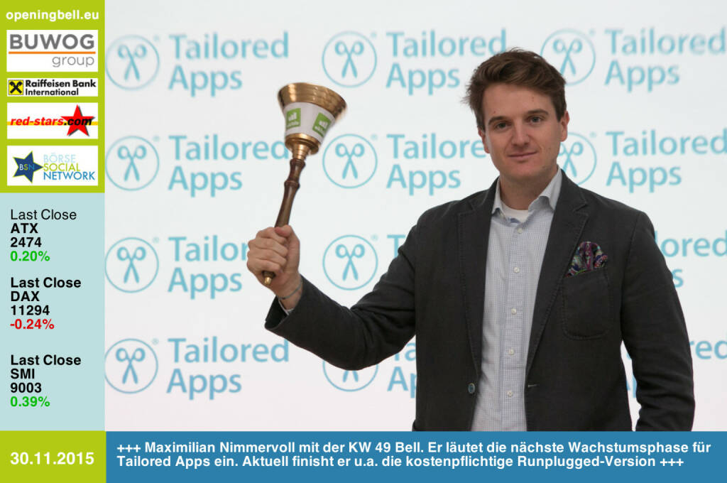#openingbell am 30.11.: Maximilian Nimmervoll mit der KW 49 Opening Bell. Er läutet die nächste Wachstumsphase für Tailored Apps ein. Aktuell finisht er u.a. die kostenpflichtige Runplugged-Version http://www.tailored-apps.com http://www.runplugged.com/app http://www.openingbell.eu (30.11.2015)