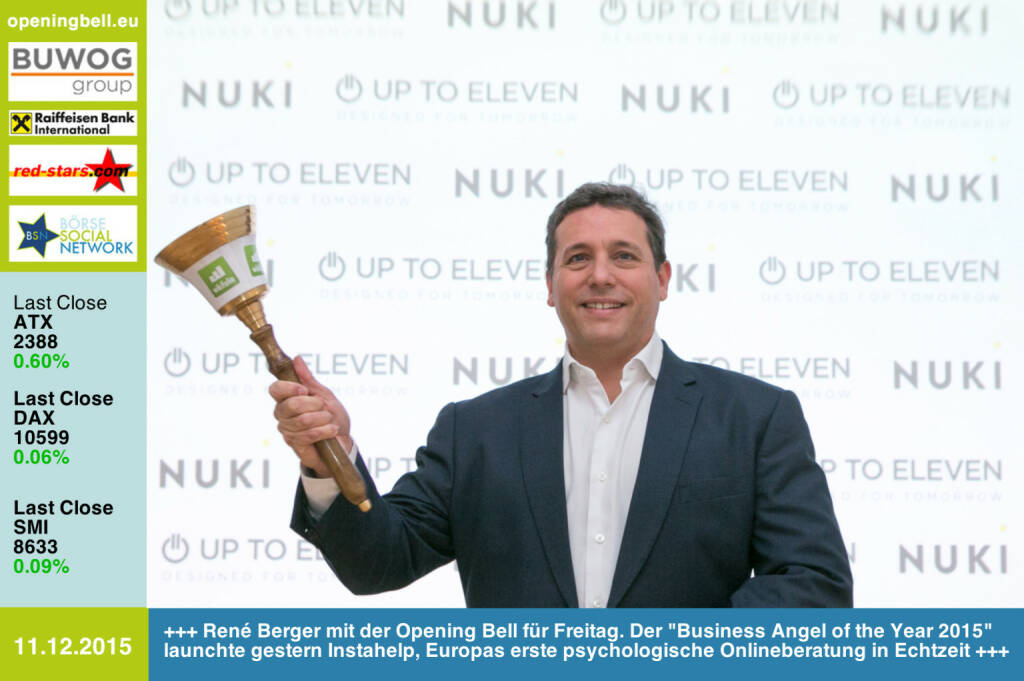#openingbell am 11.12: René Berger mit der Opening Bell für Freitag. Der "Business Angel of the Year 2015" launchte gestern Instahelp, Europas erste psychologische Onlineberatung in Echtzeit http://ut11.net http://www.openingbell.eu (11.12.2015)