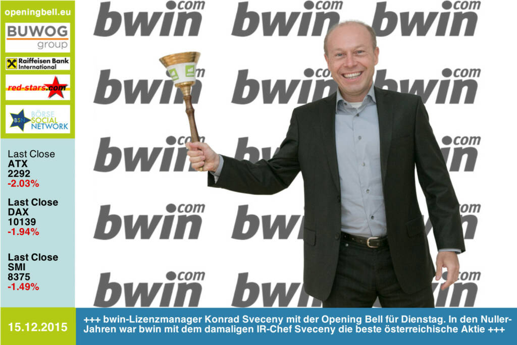 #openingbell am 15.12: bwin-Lizenzmanager Konrad Sveceny mit der Opening Bell für Dienstag. In den Nuller-Jahren war bwin mit dem damaligen IR-Chef Sveceny die beste österreichische Aktie https://www.bwin.com/de https://www.bwinparty.com http://www.openingbell.eu (15.12.2015)