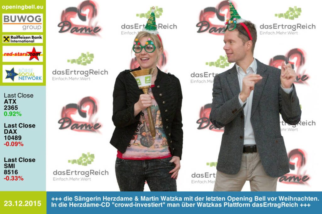 #openingbell am 23.12.: Die Sängerin Herzdame & Martin Watzka mit der letzten Opening Bell vor Weihnachten. In die Herzdame-CD "crowd-investiert" man über Watzkas Plattform dasErtragReich http://www.dasertragreich.at http://www.herzdame-music.com , siehe auch weitere Bilder mit Weihnachtshintergrund http://www.photaq.com/page/index/2269 (23.12.2015)