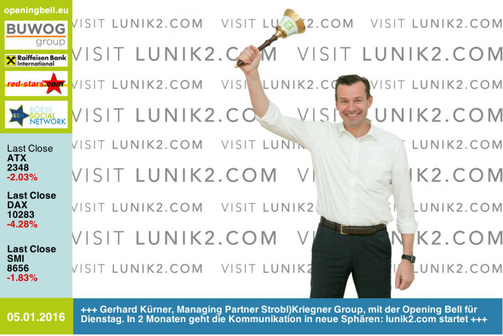 #openingbell am 5.1.: Gerhard Kürner, Managing Partner Strobl)Kriegner Group, mit der Opening Bell für Dienstag. In zwei Monaten geht die Kommunikation in neue Sphären: lunik2.com startet http://www.strobl-kriegner.com http://www.openingbell.eu (05.01.2016)