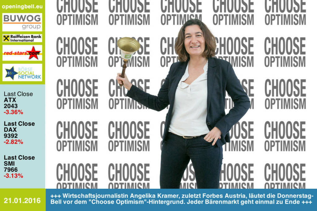 #openingbell am 21.1.: Wirtschaftsjournalistin Angelika Kramer, zuletzt Forbes Austria, läutet die Opening Bell für Donnerstag vor dem "Choose Optimism"-Hintergrund. Jeder Bärenmarkt geht einmal zu Ende ... (21.01.2016)