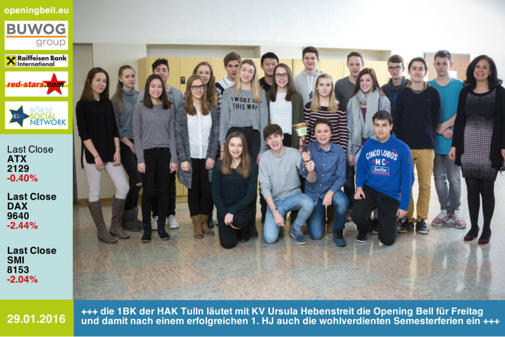#openingbell am 29.1: Die 1BK der HAK Tulln läutet mit KV Ursula Hebenstreit die Opening Bell für Freitag und damit nach einem erfolgreichen 1. HJ auch die wohlverdienten Semesterferien ein http://www.haktulln.ac.at http://www.openingbell.eu (29.01.2016)