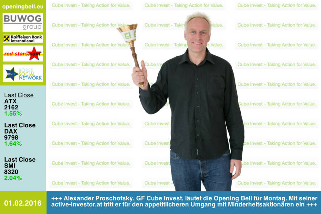 #openingbell am 1.2: Alexander Proschofsky, GF Cube Invest, läutet die Opening Bell für Montag. Mit seiner active-investor.at tritt er für einen appetitlicheren Umgang mit Minderheitsaktionären ein http://www.active-investor.at http://www.openingbell.eu (01.02.2016)