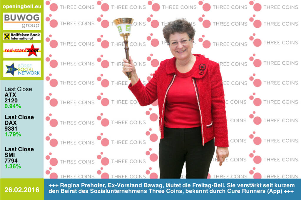 #openingbell am 26.2: Regina Prehofer, Ex-Vorstand der Bawag, läutet die Opening Bell für Freitag. Sie verstärkt seit kurzem den Beirat des Sozialunternehmens Three Coins, bekannt durch die App "Cure Runners" http://www.threecoins.org http://www.boerse-social.com (26.02.2016)