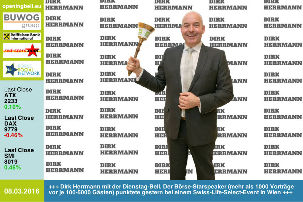 #openingbell am 8.3: Dirk Herrmann mit der Opening Bell für Dienstag. Der Börse-Starspeaker (mehr als 1000 Vorträge vor je 100-5000 Gästen) punktete gestern bei einem Swiss-Life-Select-Event in Wien http://www.openingbell.eu (08.03.2016)