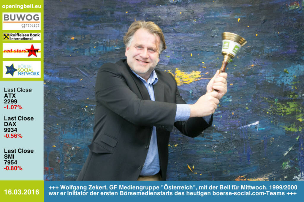 #openingbell am 16.3: Wolfgang Zekert, Geschäftsführer Mediengruppe "Österreich", mit der Opening Bell für Mittwoch. 1999/2000 war er Initiator der ersten Börsemedienstarts des heutigen boerse-social.com-Teams http://www.oe24.at http://www.openingbell.eu (16.03.2016)